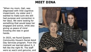 First, we meet Dina. Her mom Gail was diagnosed with mild cognitive impairment. Dina and her sister found QCH’s Social Adult Day Services program. Now her mom is happier, more social, and has something to look forward to every day. Dina says QCH didn’t just support her mom, it supported all of them.